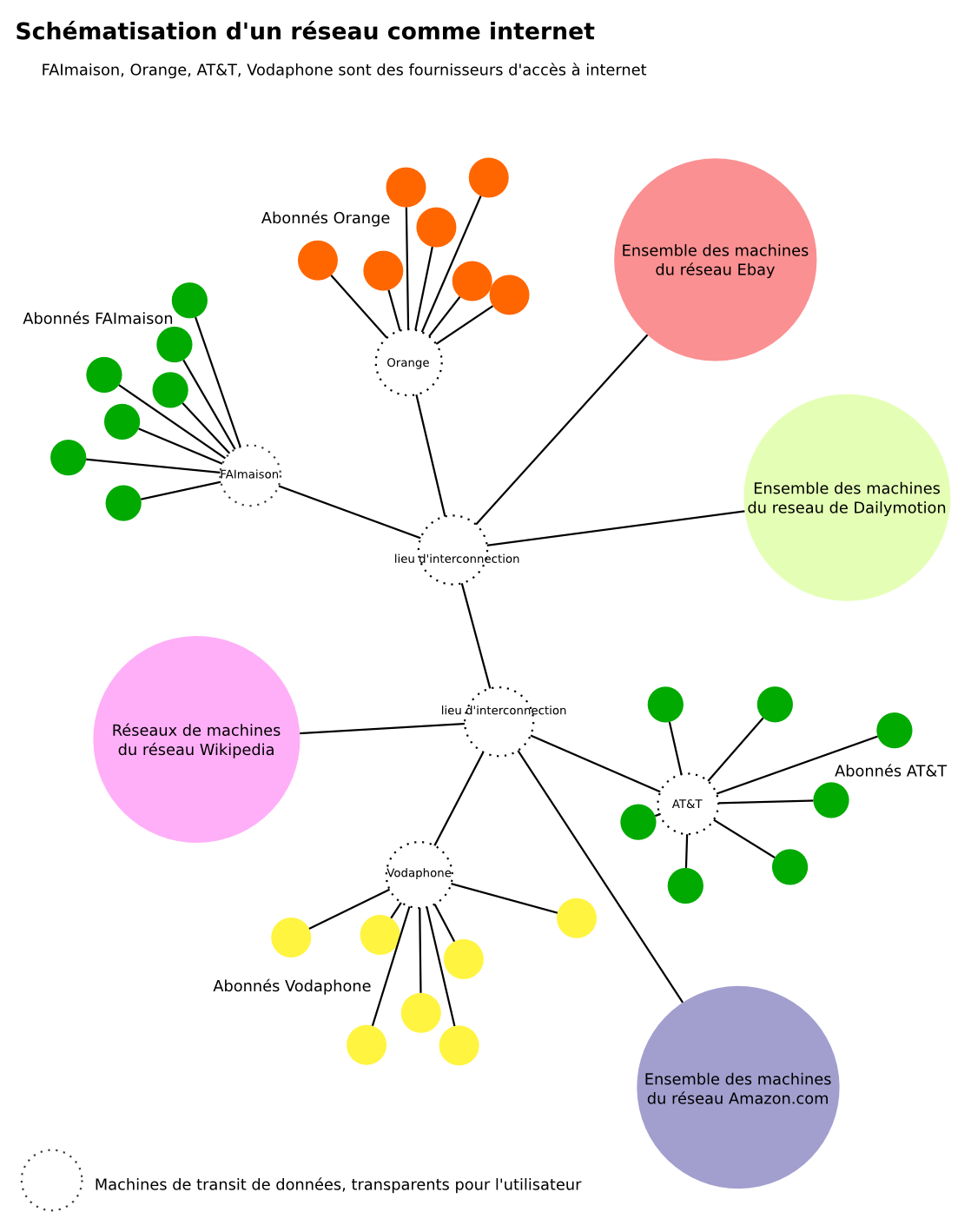 Pour se relier aux autres réseaux qui constituent Internet, et donc y relier l'ensemble de ses abonnés, un FAI peut se connecter à plusieurs endroits, où arrivent d'autres réseaux / FAI comme lui, qui sont eux mêmes connectés à d'autres endroits où sont connectés d'autres réseaux, et ainsi de suite.
