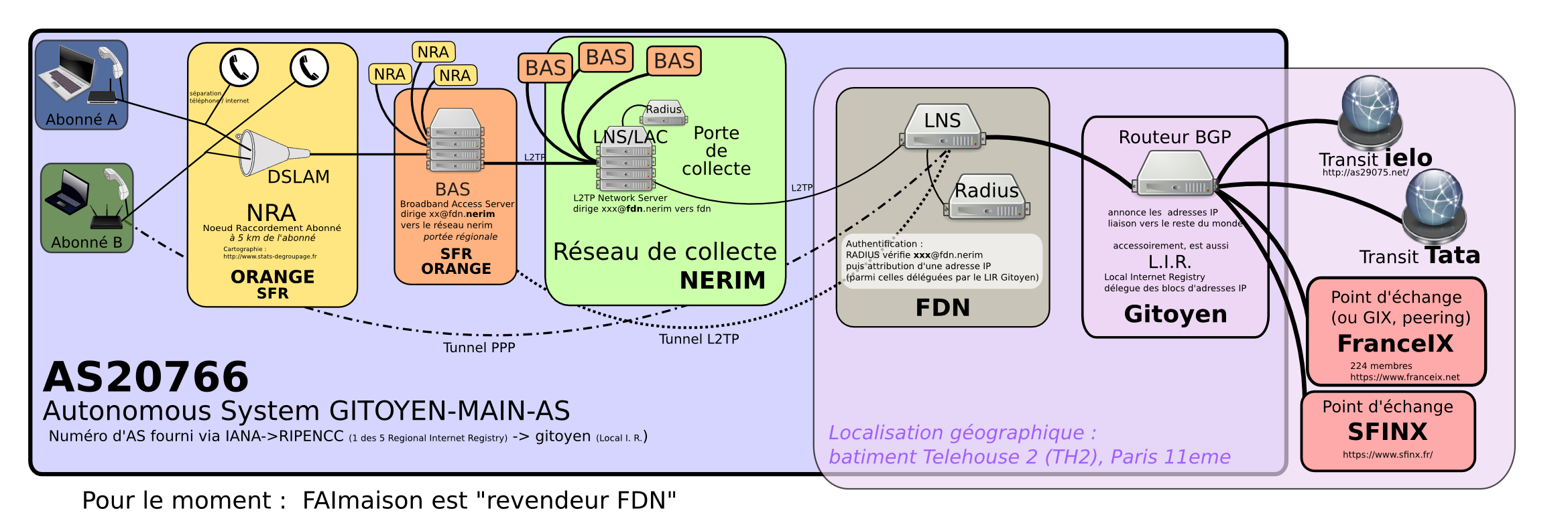 Pour FDN (et donc pour FAImaison actuellement pour l'ADSL), Gitoyen cumule les fonctions de LIR (délègue la gestion d'IP à FDN), et de connecteur au reste du monde (routeur BGP en lien avec des point d'échange et des transitaires). FDN gère lui le lien entre ses abonnés (collecte via Nerim + identification et attribution d’IP via ses propres serveur radius et LNS) et le routeur BGP de Gitoyen, lui même relié au reste du monde.